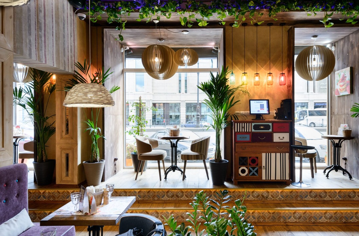 столики у окон для тех, кто на бегу, и диваны в глубине — для тех, кто пришёл надолго. Зонирование продумано так, чтобы посадка была плотной, но не тесной. Интерьер не давит стилем — он просто даёт пространство.