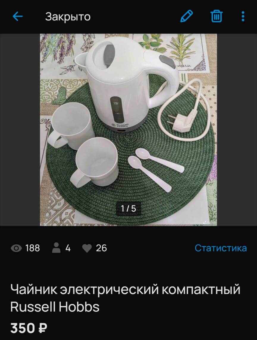Друзья, приветствую на канале "Счастлива по собственному желанию". С небольшим опозданием публикую статью про "деньги из воздуха" за апрель. Несмотря на то, что в конце апреля мы уезжали, даже за время поездки удалось продать несколько вещей. Спасибо сыну, отправлял заказы по нашей просьбе. После разбора шкафа с одеждой у меня образовалось целых 2 мешка ненужных вещей. Это самые обыкновенные вещи: футболки, брюки, шорты и даже купальник в хорошем состоянии, но которые по разным причинам мне сейчас не подходят. В одном мешке оказались зимние вещи, в основном джемперы. Я рассудила, что сейчас их выставлять бессмысленно, подожду конца лета. А во втором - летние. И этот мешок полностью удалось распродать буквально за пару недель. Итак, расскажу подробнее о продажах апреля. Дорожный чайник с чашками. Долговис. Никак от него было не избавиться. Очень качественная и хорошая, но никому не нужная вещь. В квартирах, которые мы снимаем в путешествиях, на теплоходе, в санатории - везде есть чайник