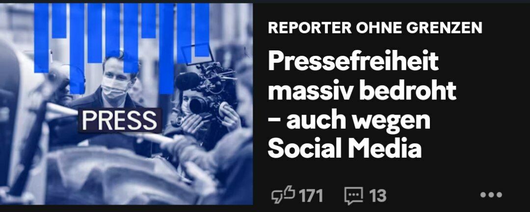 📌 " Согласно последнему индексу "Репортеров без границ", свобода прессы в мире все больше находится под угрозой. Отчасти это связано с тоталитарными правительствами, а также со все более сложной экономической ситуацией. В частности, в цифровом секторе большая часть рекламных расходов приходится на международные технологические конгломераты и их платформы социальных сетей " 👀 Свободу прессе ! В первую очередь от финансирования со стороны государства! Пусть победит сильнейший и честнейший . Или в демокоатиях это тоже не работает?