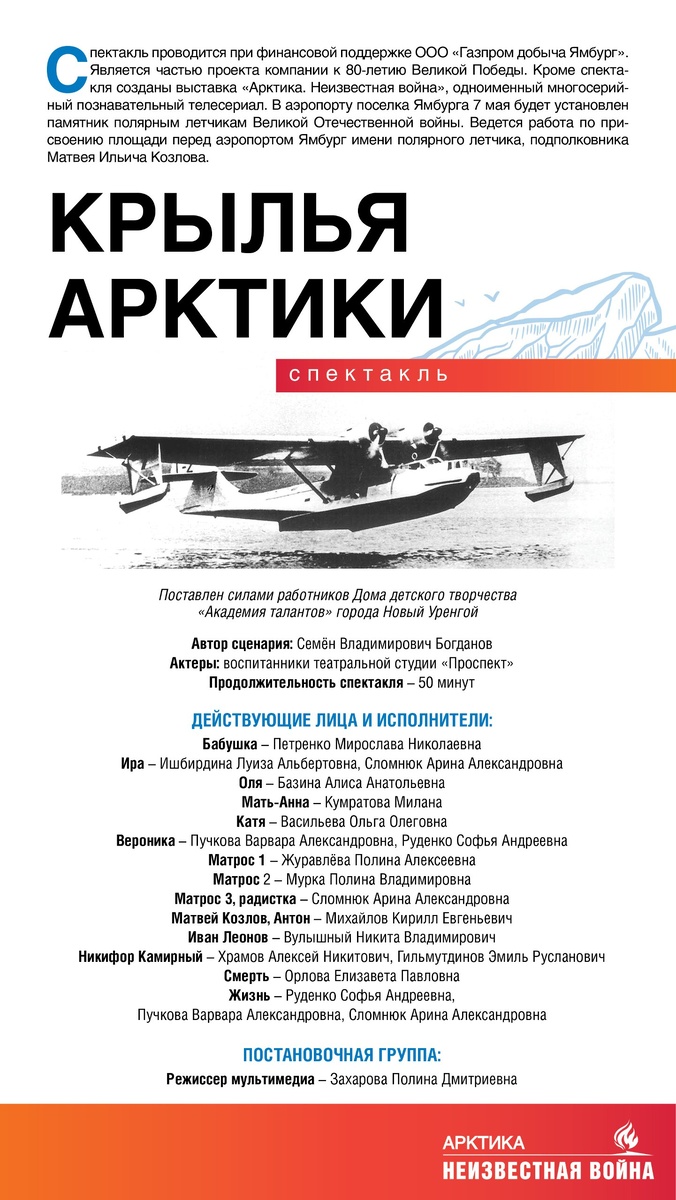 #Победа80 Сегодня, 5 мая 2025 года, в 18:00 в гимназии города Новый Уренгой состоится специальный показ камерного спектакля «Крылья Арктики». Он поставлен по пьесе Семена Богданова театральным коллективом Дома детского творчества «Академия талантов» при финансовой поддержке #газпромдобычаямбург. Актеры-подростки погрузились в тему боевых столкновений на Северном морском пути в 1942–1944 годах. Действия, о которых идет речь, случились в водах Карского моря, рядом с территорией современного Ямало-Ненецкого автономного округа. Приглашаем на спектакль. Вход свободный. Приходите с родными и близкими. Будет интересно и познавательно!