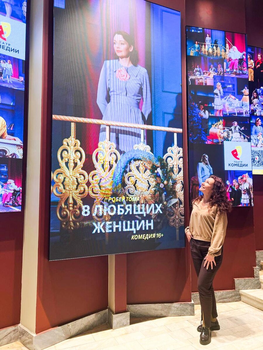 Мне уже несколько раз довелось посетить Театр Комедии, и каждый раз это была новая площадка. «Похороните меня за плинтусом» смотрела на Сцене на ВДНХ (м. ВДНХ, Мира пр-т, д.119, стр.84), «Идеальный муж» в ООЦ Им. Моссовета (м. «Преображенская площадь», Преображенская пл., д.12). Сейчас насладилась детективной комедией «8 любящих женщин» на Основной сцене (м. «Достоевская», Суворовская пл., д. 1/52, к.2). Еще одна Сцена на Олимпийском (м. «Достоевская», Олимпийский пр-т, д.7, к.2), затем в Доме-музее В. Высоцкого (м. «Таганская», Высоцкого ул., д.3, стр. 1) и Новая сцена (м. «Достоевская», Суворовская пл., д. 1/52, к.2). Вот какая обширная география у театра! На самом деле, это очень удобно, иметь возможность выбрать для себя более комфортное расположение, чтоб увидеть желанный спектакль, говорю, как зритель, потому что при выборе театра, так или иначе, встает вопрос, как быстрее добраться домой после его окончания.