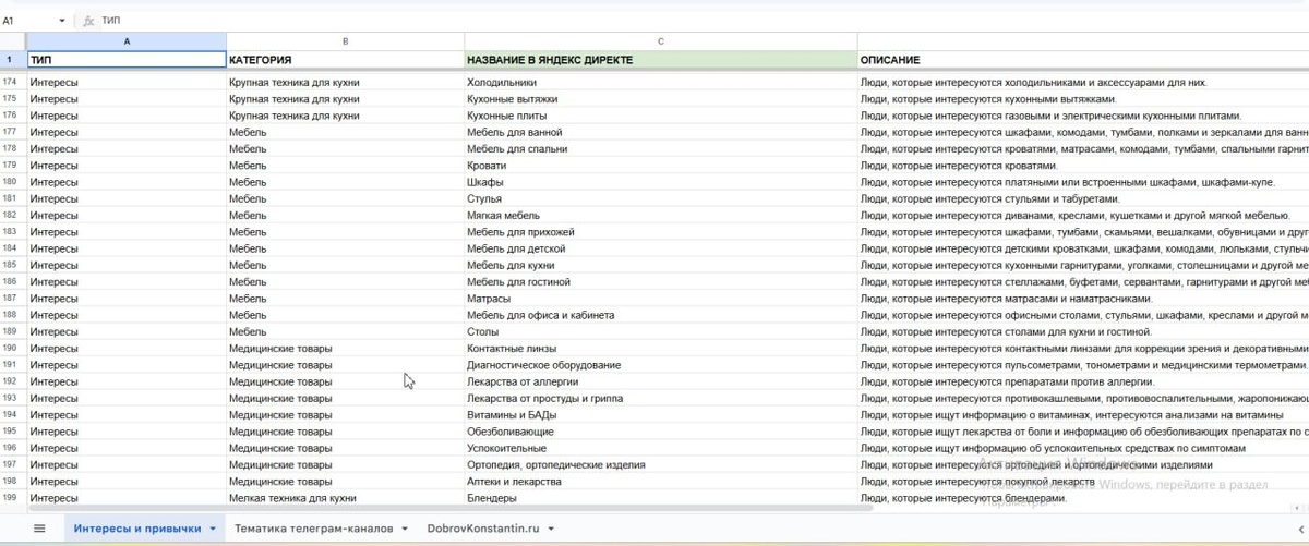 Список всех интересов в яндекс директ для РСЯ Нашел в сети список всех интересов для рекламы в РСЯ. Очень удобно. Да, есть в справке данный список, но считаю что таблицей удобно. Так же в таблице в отдельной вкладке есть список интересов для рекламы в ТГ каналах
