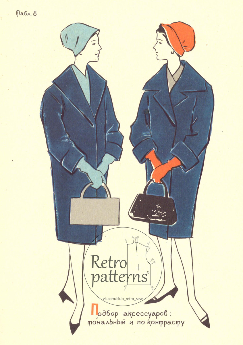 Из книги "О культуре одежды", автор Л. Ефремова, Москва, 1960 год Часть 1 Часть 2 Часть 3 Часть 4 Часть 5 *** продолжение темы "Цвет и ансамбль" (начало в части 4 и 5) До сих пор мы говорили о цвете в отношении всего вашего гардероба в целом. Но ведь ансамбль необходимо хорошо подобрать в каждом отдельном случае. В моде последних лет можно различить две основные линии подбора дополнений: иногда их цвет как бы развивает в различных оттенках цвет основного туалета. Такое решение ансамбля принято называть тональным; второй вариант - подбор цветов по контрасту к основному (табл. 8). В том и другом случае все предметы создают красивое гармоничное сочетание. В контрастном решении лучше делать один из цветов ярким, а другой спокойным, нейтральным. (Оранжевый - с коричневым, синий - с красным, серый с красным или зеленым и т.д.) Употреблять в контрастном сочетании два ярких цвета, одинаковых по силе, не рекомендуется. (Исключением могут быть яркие пляжные или дачные платья или рисунки ярких ле