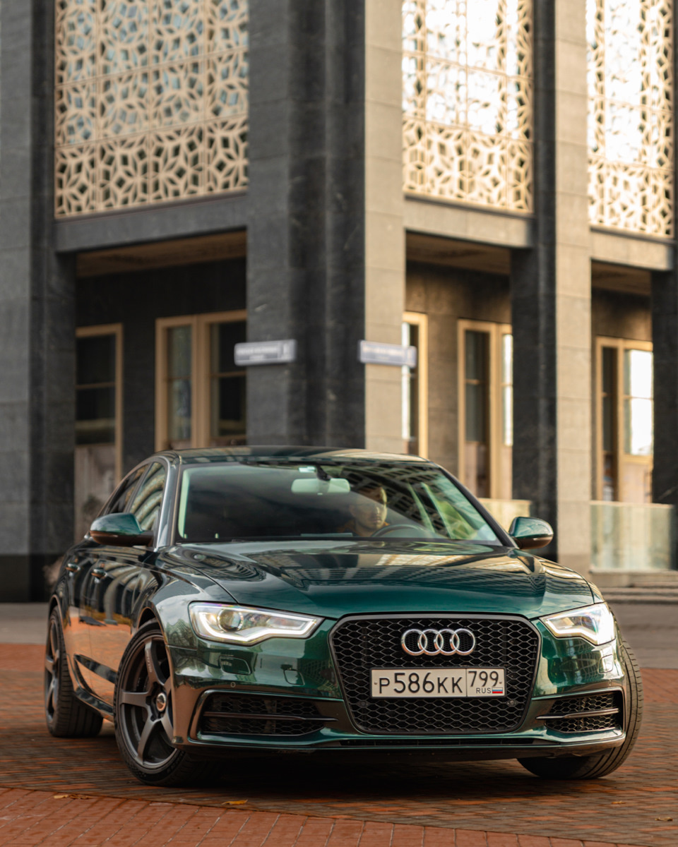 Прекрасная Audi A6 C7 в шикарном цвете британский гоночный зеленый. Для такой Ауди он эксклюзивный. Сколько Денис вложил в это авто времени, труда, денег не счесть!
