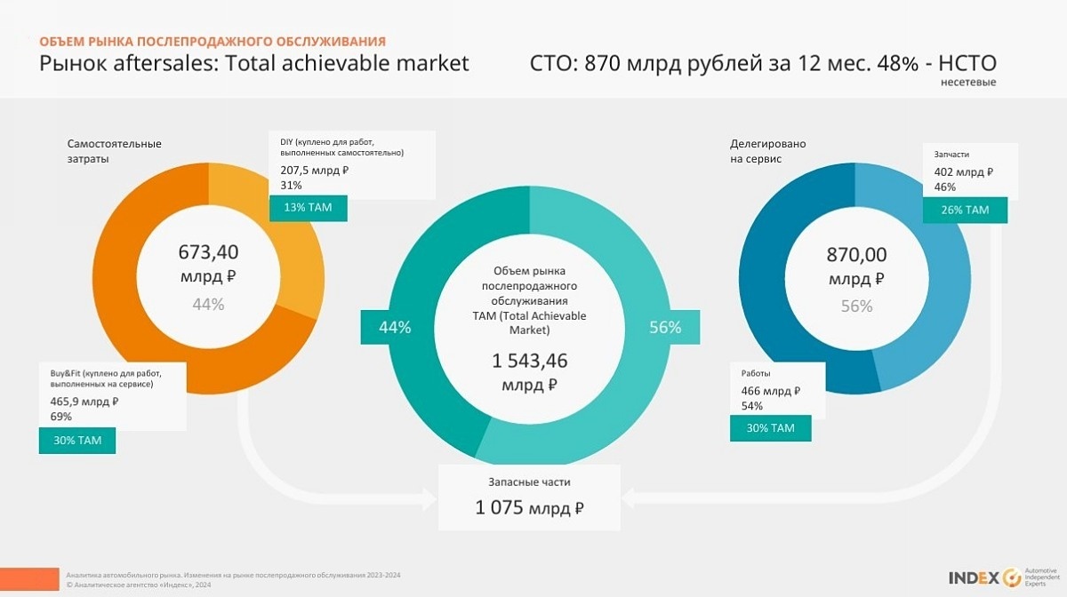 Объем рынка услуг СТО в 2024 году составил 870 млрд рублей (или 56% TAM). Из них 466 млрд рублей (30% TAM) пришлось на работы, а 402 млрд рублей (46% TAM) — на запчасти. Чуть менее половины рынка автосервисных услуг (48%) в минувшем году, по данным «Индекса», пришлось на долю несетевых независимых СТО.