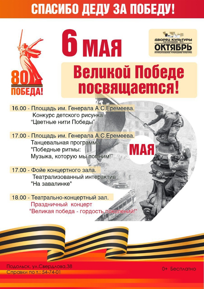 ✨ К 80-летию ВЕЛИКОЙ ОТЕЧЕСТВЕННОЙ ВОЙНЫ 💢В 16.00 на площади им. Генерала А.С.Еремеева состоится конкурс детского рисунка «Цветные нити Победы» 💢В 17.00 на площади им. Генерала А.С.Еремеева гости праздника смогут принять участие в танцевальной программе «Победные ритмы: Музыка, которую мы помним!». 💢В 17.00 в фойе Дворца будет организована театрализация «На завалинке», с участием театральных коллективов ДК. 💢В 18.00 ждём всех на праздничном театрализованном концерте «Великая победа - гордость поколений!». 🚫 Возраст: 0+ 📆 06.05.2025 🕒 16:00 🏢 Дворец культуры «Октябрь» 📍 г. Подольск, ул. Свердлова, д.38 💰 Вход свободный❗️ #webПодольск ✅ Мероприятия Подольск https://dzen.ru/id/66ed500f7b5671493eca3fd6 http://vk.com/podolsk_events http://dzen.ru/podolsk_events