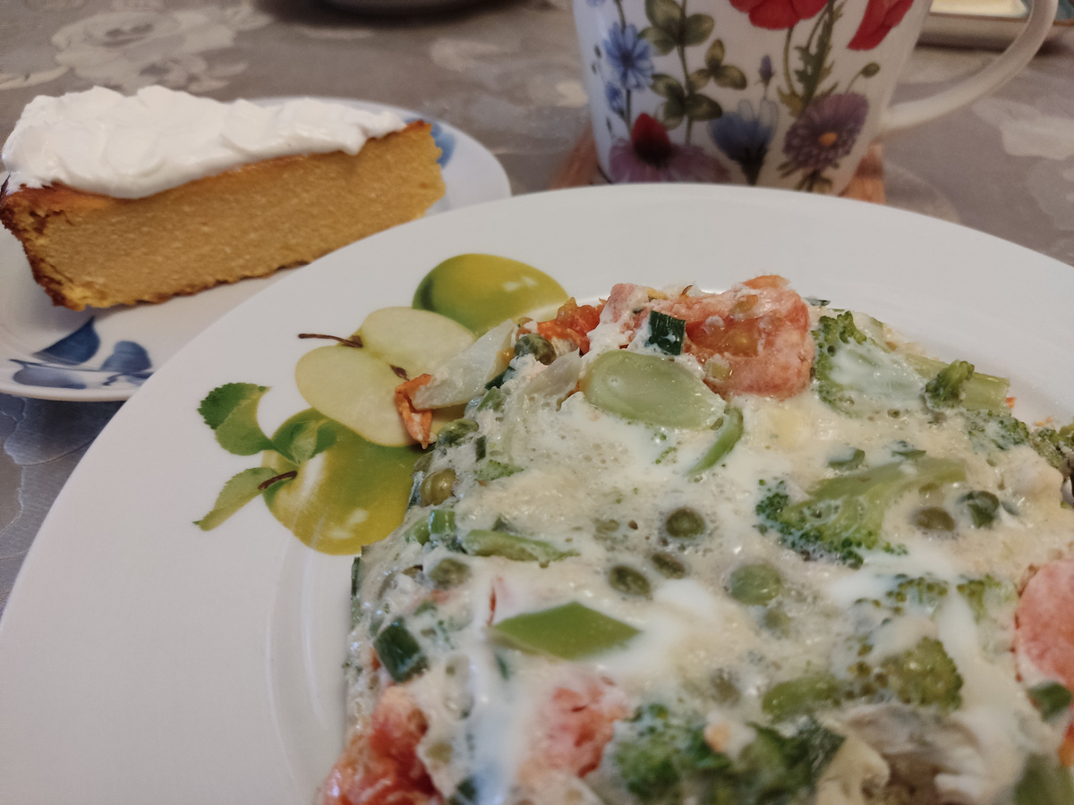 Омлет с брокколи, зелёным горошком и помидором. Творожно-тыквенная запеканка со сметаной.