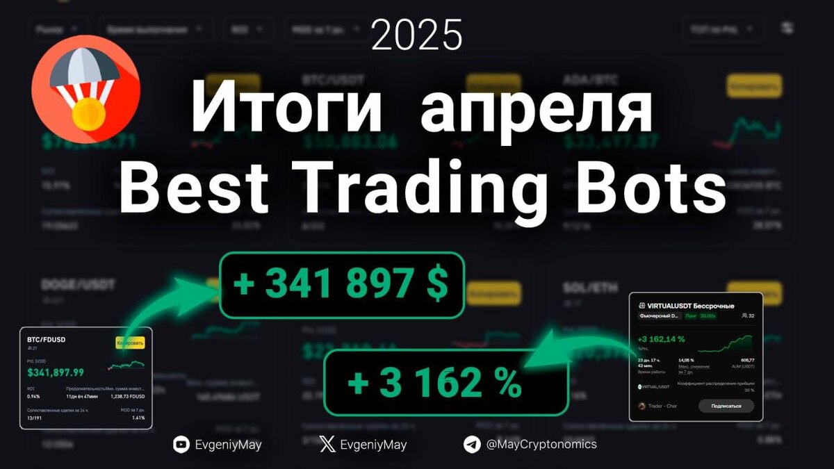 🎙В среду, 7 мая в 17:00 Мск, встретимся на вебинаре «Итоги апреля 2025. Best Trading Bots» + проведем розыгрыш призов (100 USDT в монете, которую выберем голосованием - https://www.cryptonomos.pro/giveaway) ✅ Записаться здесь https://www.cryptonomos.pro/webinar Традиционно подведем итоги месяца, посмотрим на лидеров апреля и свои результаты, оценим настройки и доходность. Посмотрим фото и расскажу про поездку в Дубай 🍌 Разберем: Лучшие результаты по доходности PNL/ROI на Binance и OKX Поищем интересные параметры и диапазоны Визуализируем Grid/DCA Bot на графиках Посмотрим на текущие результаты ботов на OKX, Binance, Veles, 3Commas Взглянем на рынок 💯 Правильное обучение здесь - https://www.cryptonomos.pro/ 💰 Отзывы и результаты здесь https://t.me/MayCryptonomicsReviews P. S. Зовите друзей - пусть просвещаются 😉 #webinar #Results #TradingBots #April2025 #Binance #OKX