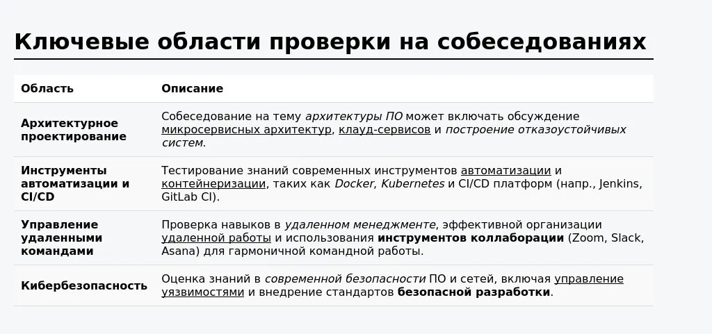 Работодатели обычно уделяют внимание следующим ключевым областям:
