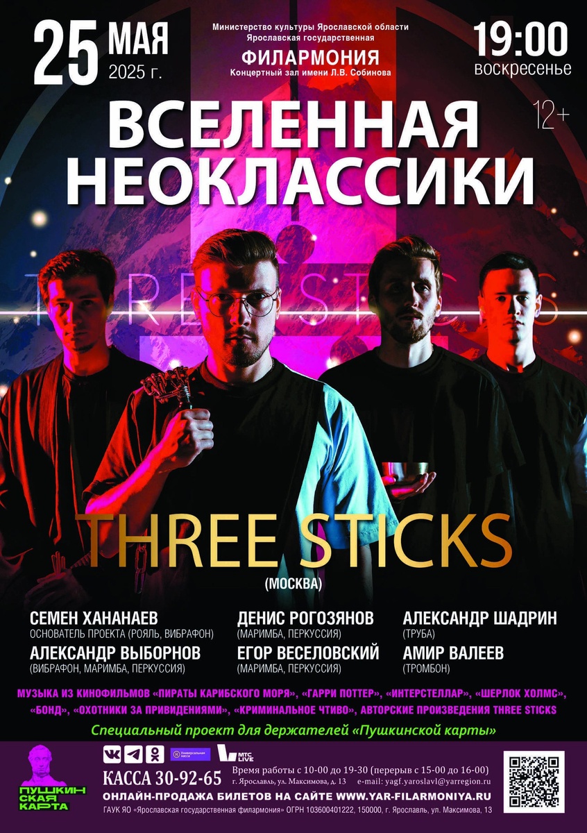25 мая 2025 г. в 19:00 программа «Вселенная неоклассики» – это возможность услышать знакомые мелодии в новом, ярком и необычном звучании. Концерт станет интересным событием для всех, кто ценит музыку и кинематограф, а также искусство оригинальных музыкальных интерпретаций. Незабываемые эмоции слушателям подарит Three Sticks в составе - Семен Хананаев (основатель проекта, рояль, вибрафон), Александр Выборнов (вибрафон, маримба, перкуссия), Денис Рогозянов (маримба, перкуссия), Егор Веселовский (маримба, перкуссия), Александр Шадрин (труба), Амир Валеев (тромбон). Билеты на сайте филармонии https://clck.ru/3LsNRi Возможна покупка по Пушкинской карте!