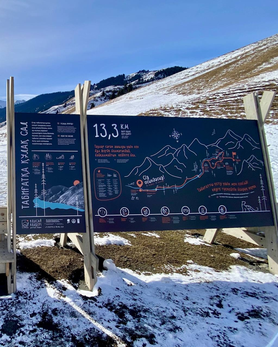 И помогает нам в этом инфографика — способ подачи информации в визуальных формах: картах, пиктограммах, схемах. Инфографика решает три важные задачи: 🌱 привлечь внимание — в большом массиве информации она выделяется и цепляет взгляд; 🌱 рассказать просто о сложном — наглядность помогает упорядочить данные; 🌱 охватить больше людей — ёмкая визуализация для большинства работает понятнее и доступнее текста. А теперь к примерам! Карта как элемент инфографики — главный способ показать маршрут тропы и отметить ключевые точки на нём. Тропы могут быть разной протяжённости и сложности: например, 13 км, как «Услышь природу» в нацпарке Кольсайские озёра, или несколько небольших тропинок от 300 м до 3 км, как в нацпарке Смольный. Независимо от маршрута, инфографичный дизайн карты делает отображение пути интуитивно понятным и информативным. Карты также помогают рассказывать факты: например, в экспозиции Дом дикой лошади в Оренбургском заповеднике мы добавили на стенд карту России и отметили на ней