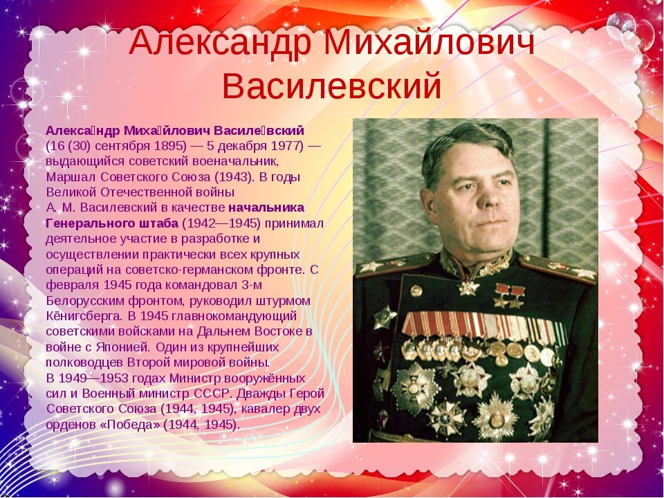 Александр Михайлович Василевский — один из самых титулованных военачальников Великой Отечественной войны, награждённый высшими наградами СССР, Российской империи и иностранных государств.