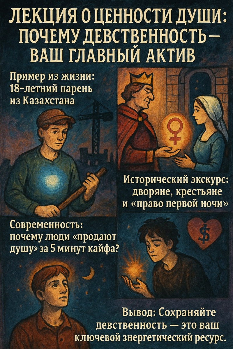 🔮 Лекция о ценности души: почему девственность — ваш главный актив? 🌍 Пример из жизни: 18-летний парень из Казахстана В лекции разбирается история молодого человека, который в 18 лет сохранил девственность, не пьёт, не курит и работает на стройке у отца без оплаты. Несмотря на сложные условия (коррупция, насилие в стране, давление семьи), его душа оценивается как «дорогая» из-за чистоты, дисциплины и нерастраченной энергии. 🏰 Исторический экскурс: дворяне, крестьяне и «право первой ночи» Лектор вспоминает средневековые обычаи, где дворяне забирали девственность крестьянок. Почему? 👉 Девственность считалась энергетическим ресурсом, который усиливал статус и силу владельца. Аналогии проводятся с правителями вроде Чингисхана, которые перед битвами «подпитывались» энергией девственниц. 💔 Современность: почему люди «продают душу» за 5 минут кайфа? Сегодня общество высмеивает девственность, а подростки «спускают» её на вписках, даже не понимая ценности. Лектор сравнивает это с проигр