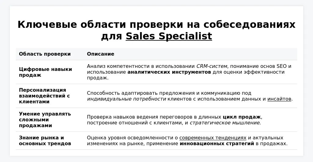 Приготовка к собеседованию на должность Sales Specialist начинается с глубокого анализа вакансии и исследования компании. Первое, что стоит сделать — это выявить ключевые soft skills в описании вакансии. Обычно это навыки коммуникации, умение работать в команде и способности к разрешению конфликтов.
