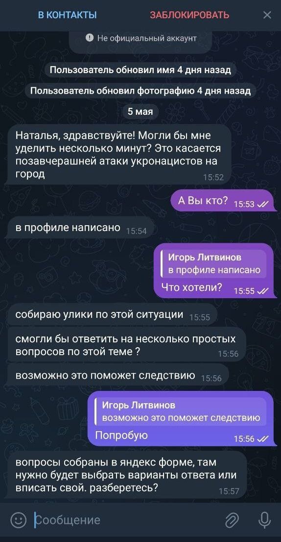В профиле написано Следователь СК РФ. Но после того, как я ему написала, что следователи не пишут в Телеграме, он молча удалили наш чат.