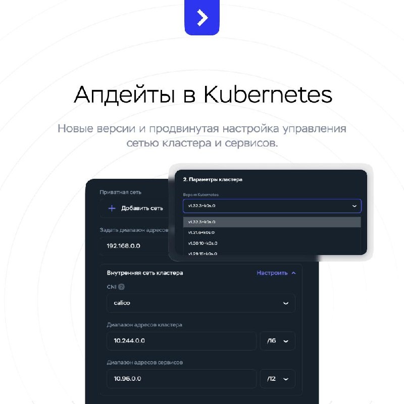 Апдейты в Kubernetes — новые версии и продвинутые настройки сети ⚙️ Встречайте целую пачку обновлений для ваших кластеров. Обо всем по порядку: 1️⃣ Доставили новые версии, еще больше стабильности, безопасности и оптимизации. v1.29.15 — фикс логов и работы планировщика. v1.30.10 — ускорение kube-proxy и улучшение отказоустойчивости. v1.31.6 — оптимизация kube-scheduler для более точного подбора узлов. v1.32.3 — улучшение graceful shutdown (плавное завершение работы подов). 2️⃣ Добавили два ключевых параметра для управления сетью кластера: Диапазон адресов кластера. Используется для назначения IP-адресов подам. Каждый под получает свой уникальный айпи из этого пула. Диапазон адресов сервисов. Такие адреса не видны за пределами кластера и используются только внутри. Заценить релизы в Kubernetes →