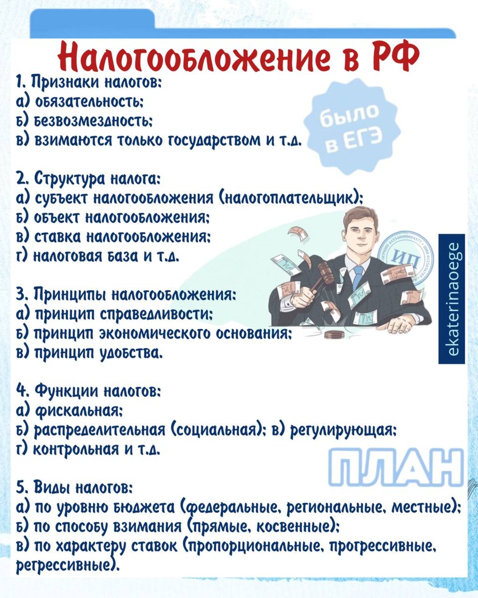 Ну, и как провели 🍖первомайские праздники? Надеюсь, вы не забросили подготовку, потому что до ЕГЭ и ОГЭ остаётся всего ничего🫣 💙💙💙💙💙 Сегодня делюсь ещё одним планом с 💙💙💙💙💙💙💙💙💙 ◽️◽️◽️◽️«Налогообложение в РФ» ❗️Это план на максимальный балл ещё и на эти темы: - Налоги и их воздействие на экономику страны, - Налоги и их роль в экономической жизни общества, - Налоги и налоговая система РФ. Сохраняйте и запоминайте! И не жалейте ❤️ #полезноеобщага