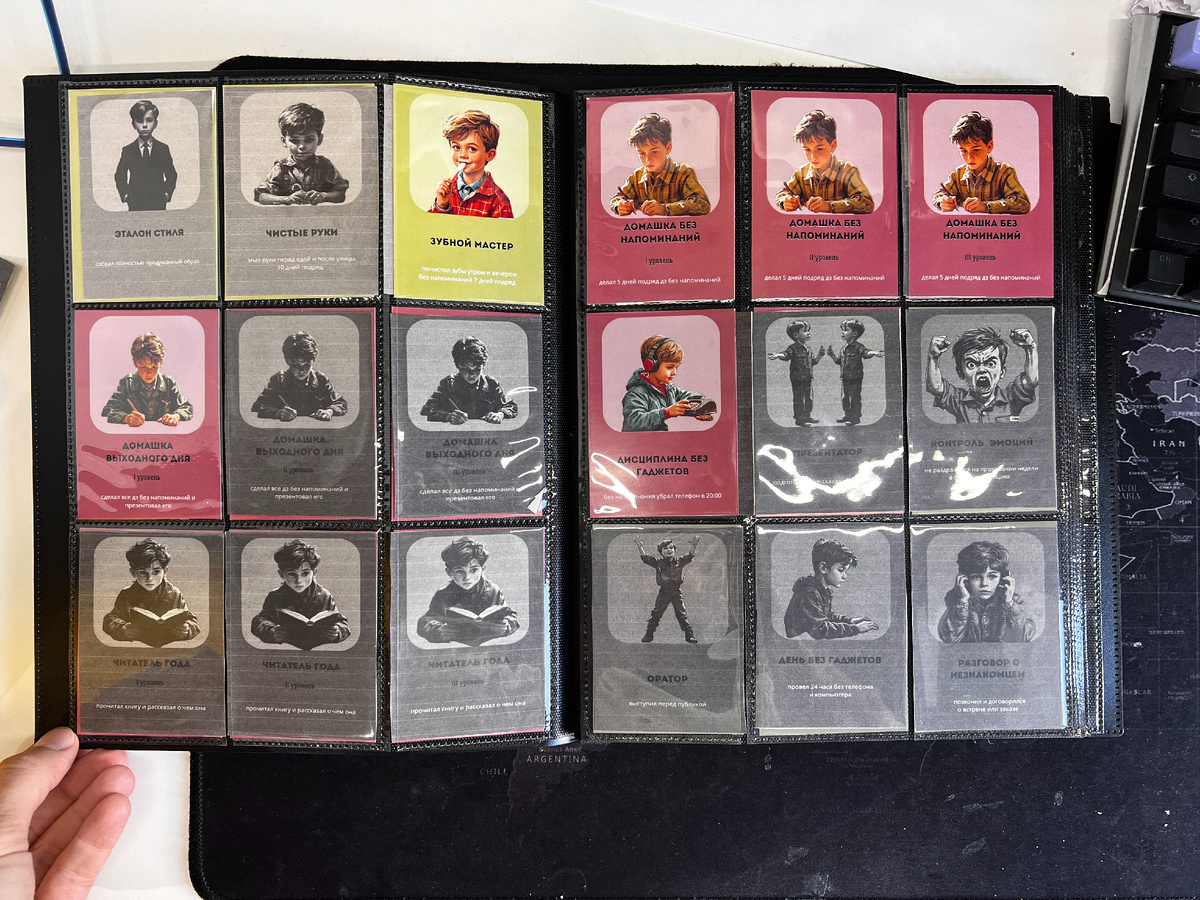 Первая система мотивации для Артема провалилась: не заинтересовала, не полетела. Сделал вторую версию. На мой взгляд — гораздо лучше. Всё упаковал в альбом. Цветные карточки — это те, что он уже заслужил. Чёрно-белые — те, что ещё надо получить. Всё как в видеоиграх. Но… этот альбом пролежал несколько месяцев. Я уже подумал — ну всё, идея нерабочая. Может, возраст не тот. Может, нужны настоящие медали, с интересным дизайном — чтобы прям хотелось получить. И тут вдруг: — Пап, посмотри JoJo's Bizarre Adventure. Я: — Обмениваю серии на бейджи. Тут же Артём сел, посчитал, составил схему. Договорились: одна часть аниме = 15 карточек. Пока вроде работает: сразу посмотрел, какие уже выполнил, какие можно добрать быстро. В общем, это последняя попытка. Если не полетит — забью. Если зайдёт — подумаю, как ещё докрутить. Если хотите попробовать — вот ссылка на карточки: 👉 https://disk.yandex.ru/d/Ej4Ap2WJLWgOyA