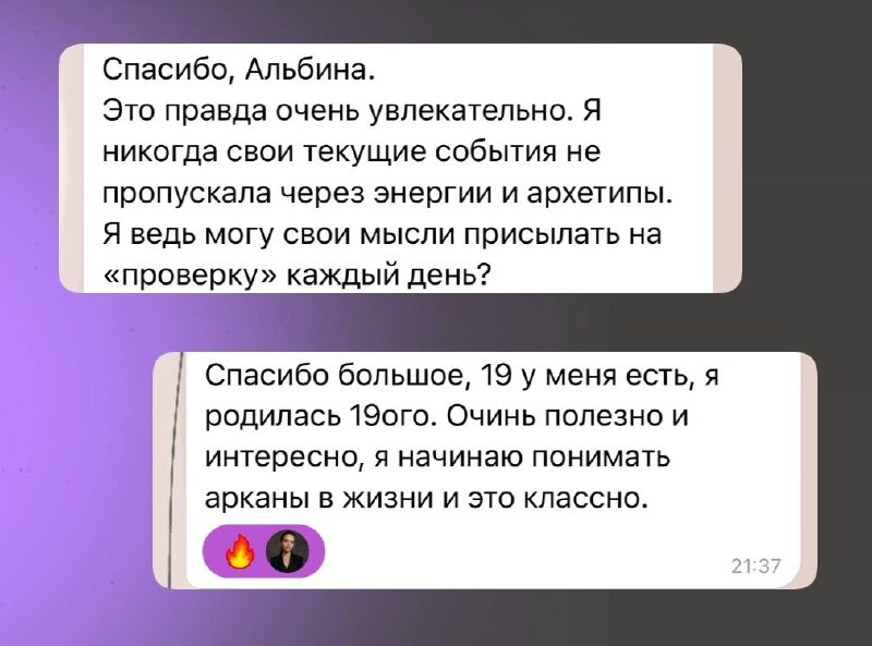 «Спасибо, Альбина. Это правда очень увлекательно. Я никогда свои текущие события не пропускала через энергии и архетипы»