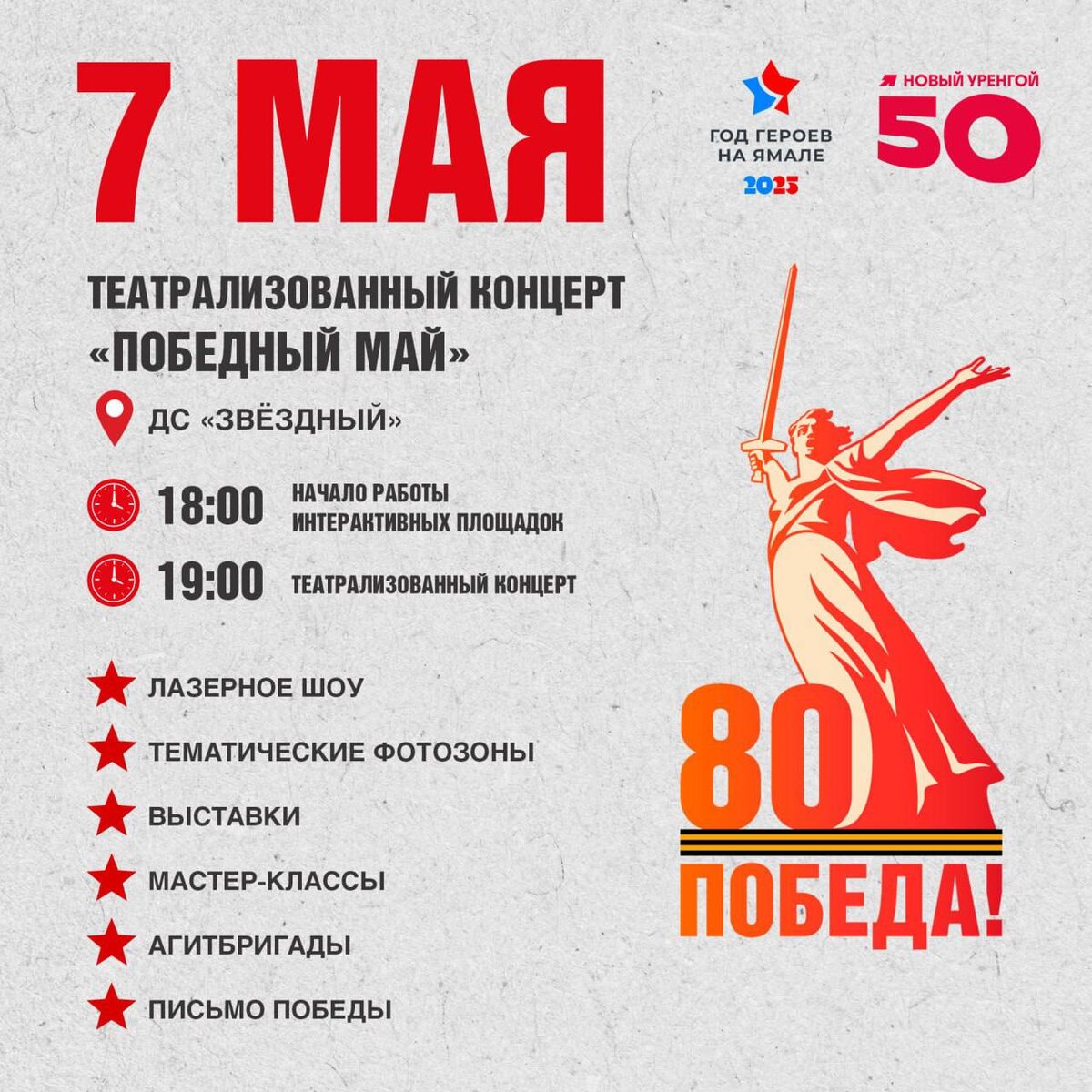 🇷🇺🇷🇺🇷🇺🇷🇺🇷🇺🇷🇺🇷🇺в Новом Уренгое! В преддверии великого праздника #Победа80 во дворце спорта «Звёздный» состоится театрализованный концерт. Также всех жителей и гостей города удивит: лазерное шоу, тематические фотозоны, выставки и т.д. #мыидём Планируйте этот вечер заранее. Подробнее — в афише. ❤️ НУР. Официально