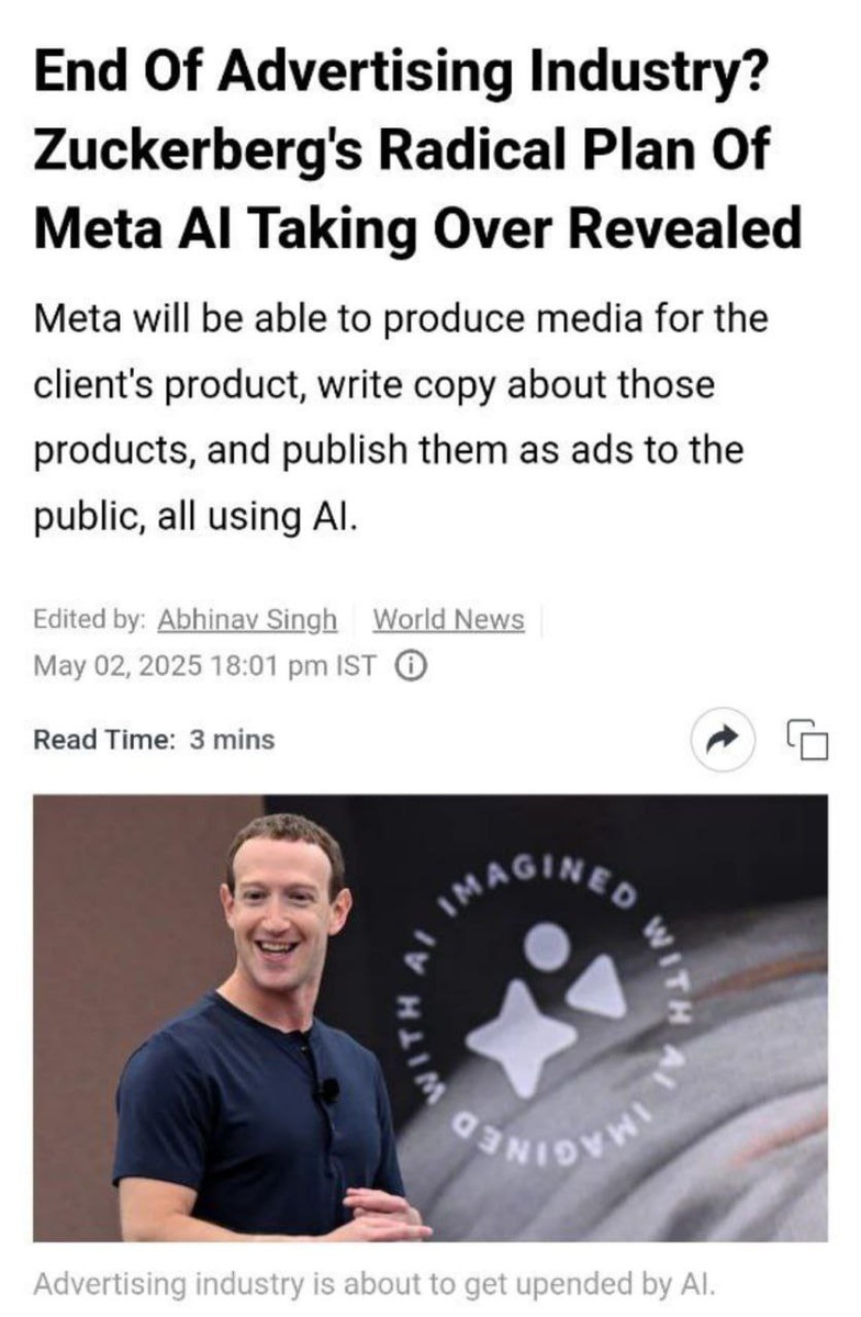 Похоже, Цукерберг всерьёз решил, что идеальный маркетинг — это маркетинг без людей. Креативщики, таргетологи, SMM-щики — приготовьтесь: ваши задачи будет выполнять искусственный интеллект.