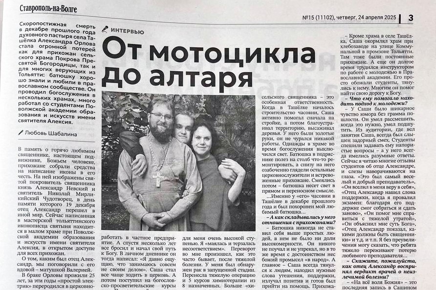 В районной газете «Ставрополь на Волге» опубликована статья памяти отца Александра Орлова В районной газете «Ставрополь на Волге» вышел трогательный материал, посвящённый памяти настоятеля храма Покрова Пресвятой Богородицы в селе Ташёлка – отца Александра Орлова, скоропостижно скончавшегося 19 декабря прошлого года. Подробнее: https://tltepar.ru/novosty/2025/05/v-rayonnoy-gazete-stavropol-na-volge-opublikovana-statya-pamyati-ottsa-aleksandra-orlova.html