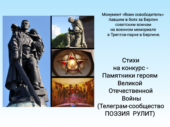 Мирное небо ~ Мирное небо, Берлин, Трептов-парк. Спасённую девочку держит в руках Наш парень, обычный, совсем молодой, Как символ Победы над страшной чумой. Стоит русский воин, в бронзе отлит, О тысячах павших он память хранит. Меч доблестных предков сжимая в руке, Из стали победы в прошедшей войне. В памятном зале есть книга одна, В ларце золотом, что хранит имена Советских героев, павших в Берлине, Здесь захороненных в братской могиле. В мозаике на стенах скорбящие лица, Как образ народа, пришедший проститься. Орден Победы героям в отраду Под куполом светит за подвиг в награду. Годы проходят, меняются страны, Последствия войн в обелисках как раны. Память хранят о героях Победы, Её нам в наследство оставили деды. Для мира мы искренне сердцем открыты, Никто не забыт и ничто не забыто. Меч, как и прежде, в надёжных руках. Кто в это не верит, познает свой крах. ~ Автор: Александр Фомин ~ Фото: Монумент «Воин освободитель» павшим в боях за Берлин советским воинам на военном мемори