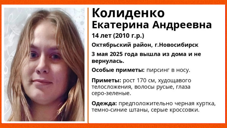 В Октябрьском районе Новосибирска без вести пропала 14-летняя Екатерина Колиденко. Как сообщили в поисково-спасательном отряде (ПСО) «ЛизаАлерт», 3 мая 2025 года она вышла из дома и не вернулась, поэтому к поискам подключились волонтеры. Приметы пропавшей: рост 170 сантиметров, худощавого телосложения, волосы русые, глаза серо-зеленые. В день исчезновения подросток предположительно была одета в черную куртку, темно-синие штаны, серые кроссовки. Из особых примет волонтеры указали, что у пропавшей есть пирсинг в носу. Если у вас есть информация о местонахождении Екатерины Колиденко, сообщите об этом по телефону ПСО 8-800-700-54-52 или наберите 112. Ранее «Вести Новосибирск» писали, что в Искитиме без вести пропал 66-летний мужчина с татуировкой на пальцах рук.