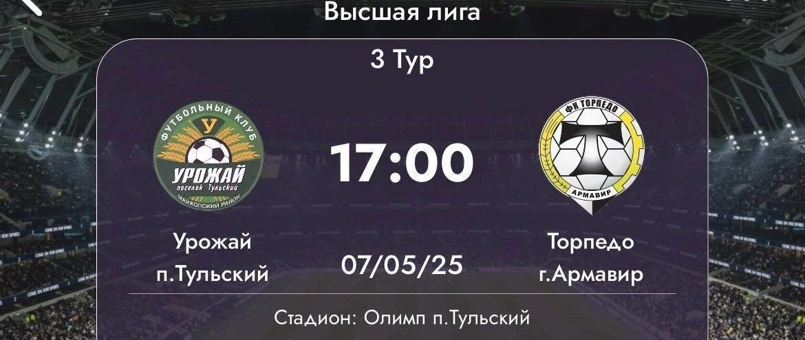 7 мая 2025 года в 17:00 состоится 3 тур Высшей лиги по футболу ⚽ на стадионе п. Тульского: