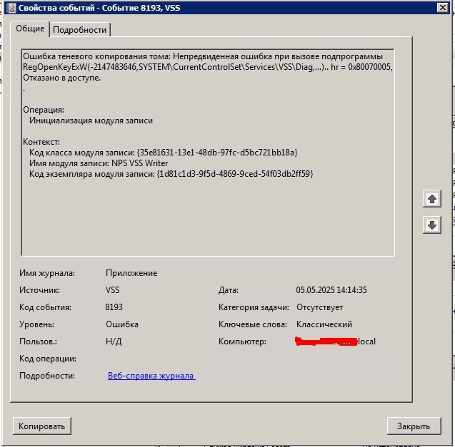 Всем привет. Взяли на обслуживание нового клиента. У клиента есть сервер на котором расположены все роли которые возможны на одной железке, ADDC(контроллер домена), dns сервер, dhcp сервер, файловый сервер. В результате чего имеем такую ошибку. Ошибка теневого копирования тома: Непредвиденная ошибка при вызове подпрограммы RegOpenKeyExW(-2147483646,SYSTEM\CurrentControlSet\Services\VSS\Diag,...).. hr = 0x80070005, Отказано в доступе. Ошибка это появляется из-за того что после установки роли dhcp-сервер у учетной записи Network Service слетает доступ на ветку реестра HKEY_LOCAL_MACHINE\SYSTEM\CurrentControlSet\Services\VSS\Diag. Одно из путей решения данной проблемы это дать полный доступ на данную ветку. Для этого открываем реестр ищем нашу указанную ветку, вызываем контекстное меню и выбираем разрешения. После этого добавляем нашу учетную запись NETWORK SERVICE и даем полный доступ. После всех изменений перезагружаем сервер.