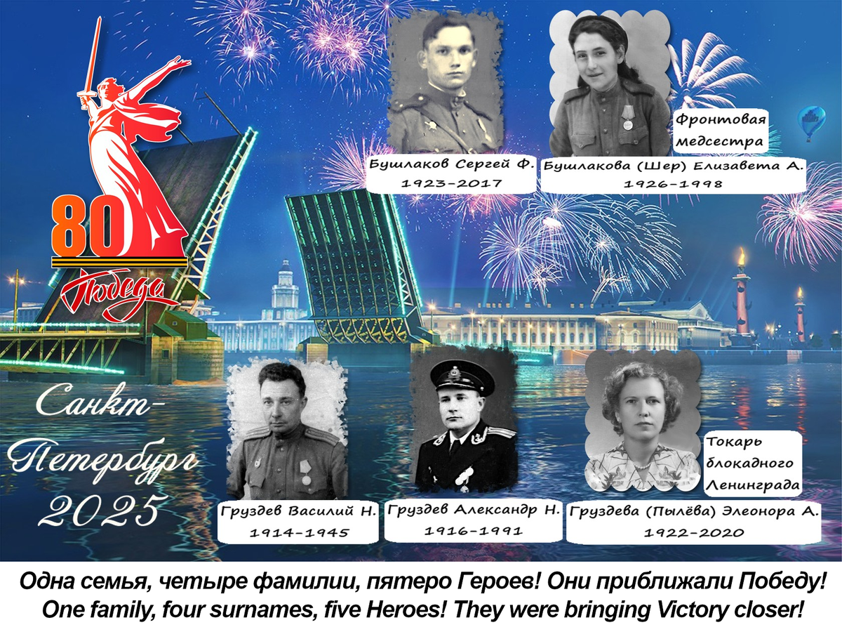 Одна семья, четыре фамилии, пятеро Героев! Они приближали Победу! One family, four surnames, five Heroes! They were bringing Victory Day closer! Бушлаковы Елизавета и Сергей, Груздевы Элеонора и Александр => похоронены на Большеохтинском кладбище С-Петербурга., Груздев В.Н. =>захоронен* 29.03.1945, в числе 823-х советских воинов, на братском Лесном кладбище (Meža kapi), в 125 метрах юго-западнее хутора Приедниеки (Priednieki), в 2-х км. от посёлка Яунпилс (Jaunpils), Тукумского района (Tukuma rajons), Латвии (Latvija). /GPS Широта (Latitude): 56.7142046; GPS Долгота (Longitude): 23.0413175/. Примечание*: Место захоронения с точностью до одного метра удалось установить через 80 лет после гибели всего несколько дней назад. История Груздева В.Н., или “Портрет Героя, написанный строкой документа”-> см. по ссылке: (https://dzen.ru/a/aDMRlSf-BWkPPcXj)