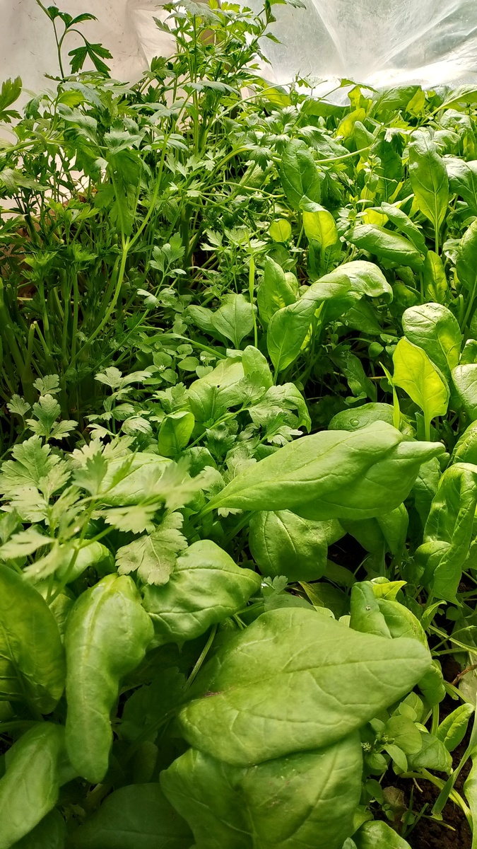 Первая зелень у меня это петрушка, срываю её сочную и красивую как только попадаю на дачу после схода снега. А себя её в середине лета. К осени она подрастёт, до конца сезона я успеваю её один раз срезать. Немного отрастает и остаётся зимовать. А т.к. петрушка морозостойка, наверное можно сказать вечнозеленая, то как только теплеет, начинает расти. На сегодня 5 мая, я уже три больших пучка срезала. Сейчас она начинает "выбрасывать" стебли с цветами. Но тут уже и шпинат вырос, и укроп подрастает.