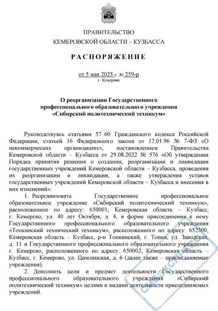 🤷🏼♂️ Два государственных техникума ликвидируют в Кузбассе «Топкинский технический техникум» (город Топки) и «Государственное профессиональное образовательное учреждение» (Кемерово), принадлежащие правительству Кузбасса, будут ликвидированы путём присоединения к «Сибирскому политехническому техникуму». Об этом говорится в опубликованном распоряжении, подписанном главой правительства Кемеровской области Андреем Пановым. Техникум в Кемерове, основанный в 1976 году, готовит специалистов по 27 рабочим профессиям, 23 из которых касаются строительства. Топкинское учреждение, созданное в 1935 году, готовит трактористов, сварщиков и машинистов. В майских постах обеих организаций в соцсетях нет ни слова о присоединении к «Сибирскому политехническому техникуму», находящемуся в Кемерове. Подписаться| Прислать новость| Помочь бустами