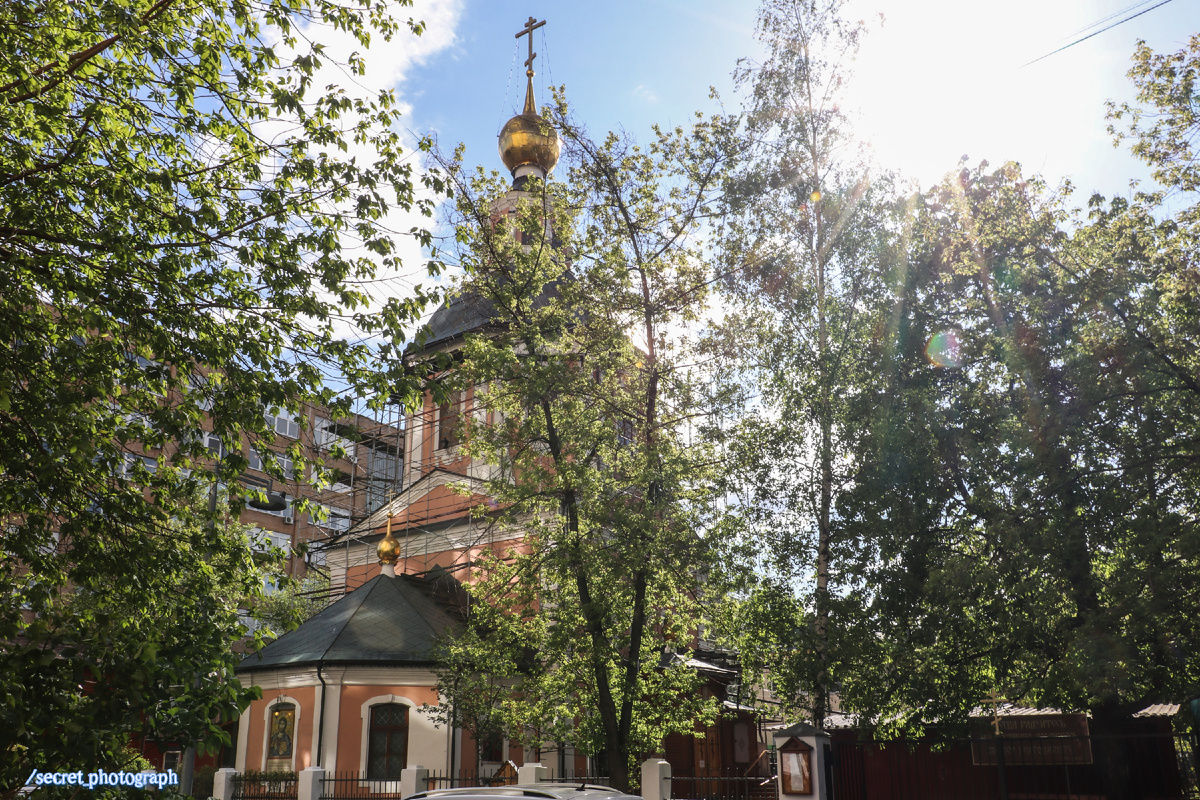 Храм, как и колоколенка, надежно укрыт зеленью, и заметить его с улицы не так просто. Москва вообще очень зеленый город.