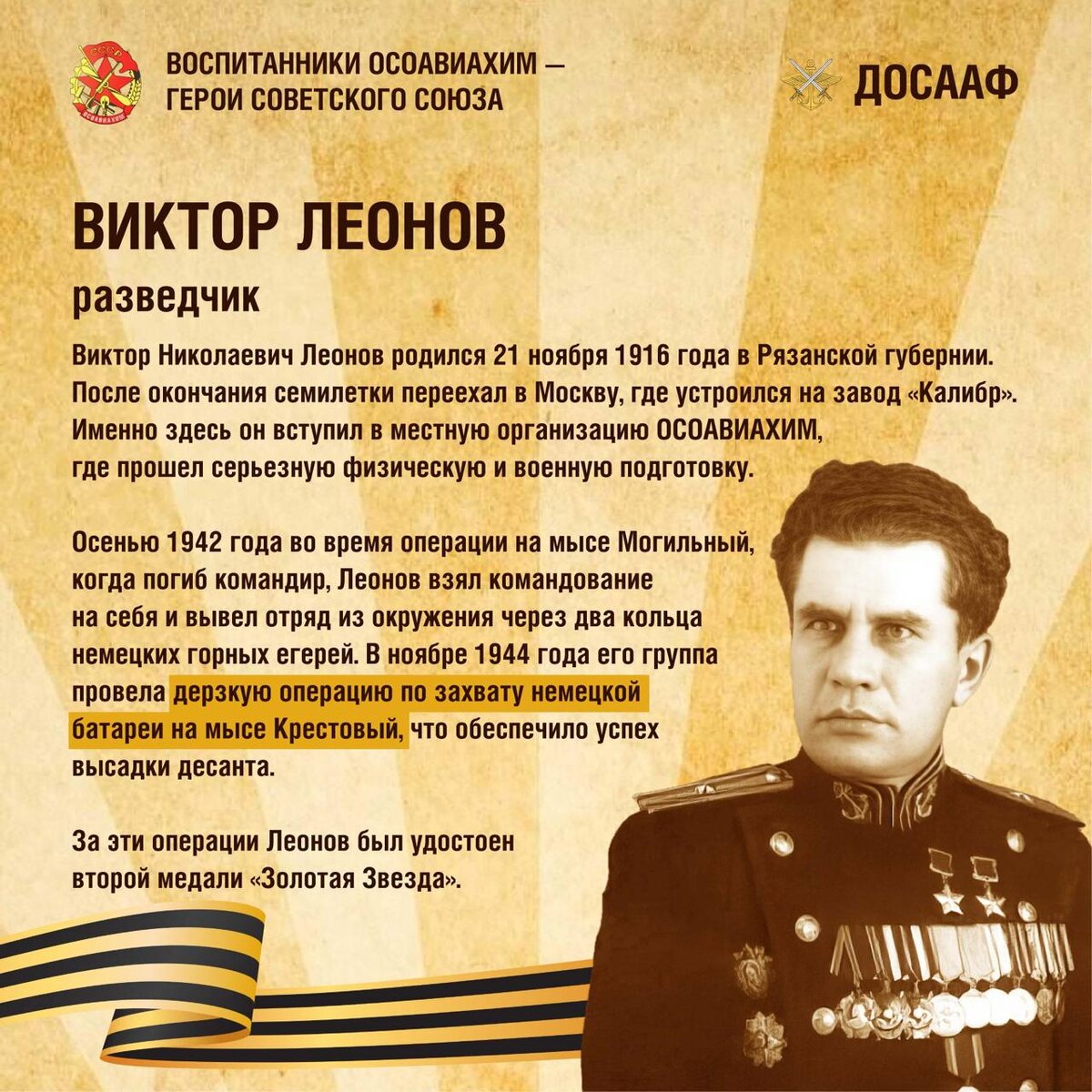 Воспитанники ОСОАВИАХИМ — Герои Советского Союза: разведчик Виктор Леонов Виктор Николаевич Леонов родился 21 ноября 1916 года в Рязанской губернии. После окончания семилетки переехал в Москву, где устроился на завод «Калибр». Именно здесь он вступил в местную организацию ОСОАВИАХИМ, где прошел серьезную физическую и военную подготовку. В 1937 году был призван на Северный флот, где служил рулевым на подводных лодках. С начала Великой Отечественной войны Леонов добровольцем перешёл в 181-й отдельный разведывательный отряд Северного флота. Осенью 1942 года во время операции на мысе Могильный, когда погиб командир, Леонов взял командование на себя и вывел отряд из окружения через два кольца немецких горных егерей. В ноябре 1944 года его группа провела дерзкую операцию по захвату немецкой батареи на мысе Крестовый, что обеспечило успех высадки десанта. В августе 1945 года отряд Леонова действовал против японских войск в Корее. Захватив несколько вражеских гарнизонов, разведчики взяли
