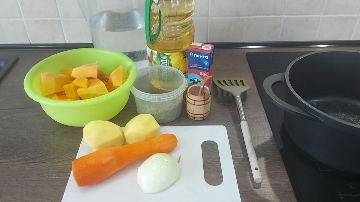 4. Добавляем тыкву и картофель, наливаем воду и варим на небольшом огне 30 минут.