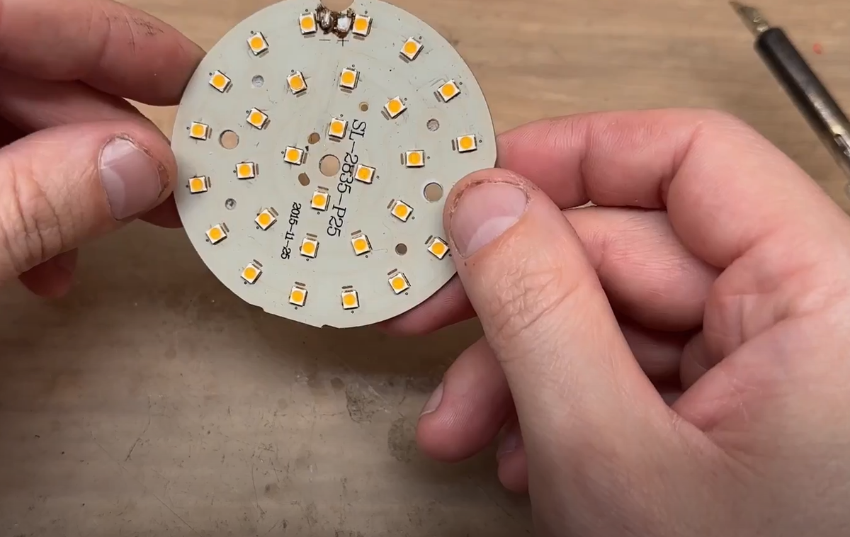 Привет всем, дорогие друзья. При пайки светодиодов частая проблема прогреть всю плату, так как обычно они представляют собой массивный радиатор из алюминия. Выпаять светодиоды проще всего паяльным феном, но не у всех он есть, а покупать ради ремонта недорого прожектора или лампочки не имеет смысла. В данной статье я покажу как можно выпаять светодиод паяльником, не понадобится дорогое оборудования и большой опыт в пайке. Буду выпаивать светодиод на большой светодиодной матрице с толстой алюминиевой подложкой. Паяльником выпаять его совсем не получается, но есть хитрый метод и сейчас я поделюсь им с Вами. На контакты светодиода наносим флюс, я использую флюс ТАГС, так как он хорошо смачивает выводы и легко смывается. Для пайки не будем использовать привычные ПОС-61, так как расплавить его будет сложно на такой теплоемкой плате, поэтому здесь нужный специальный вариант. Для выпаивания светодиода лучше всего подойдет сплав розе, он стоит недорого и всегда помогает при выпаивании деталей