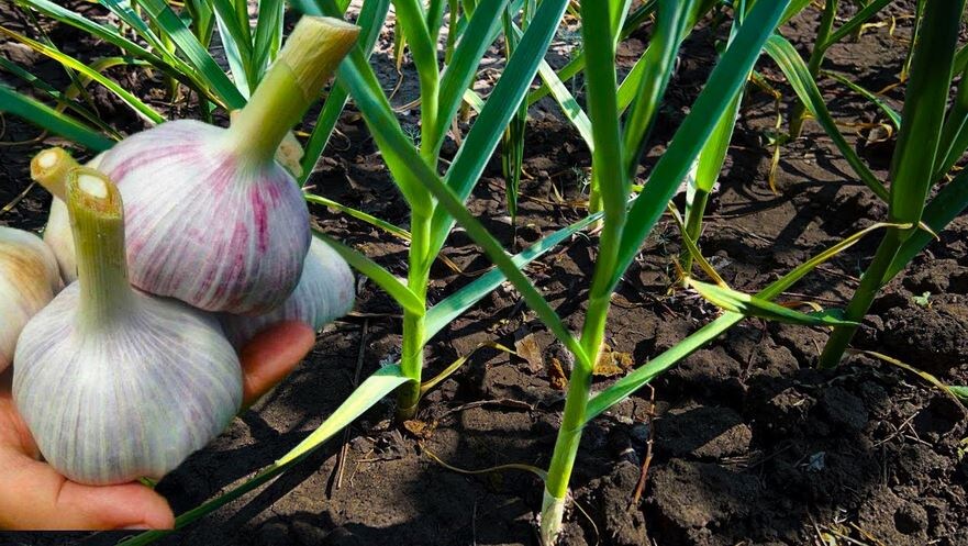 Подкормка такая, на 10 литров воды вносим по 20 грамм сульфат магния, и аммиачной селитры, перемешиваем и поливаем чеснок, так, что бы подкормка дошла до корневой системы, или же делаем канавку в междурядье, и вносим через неё подкормку, затем эти канавки заделываем. Делать это нужно аккуратно, что бы не повредить чеснок.