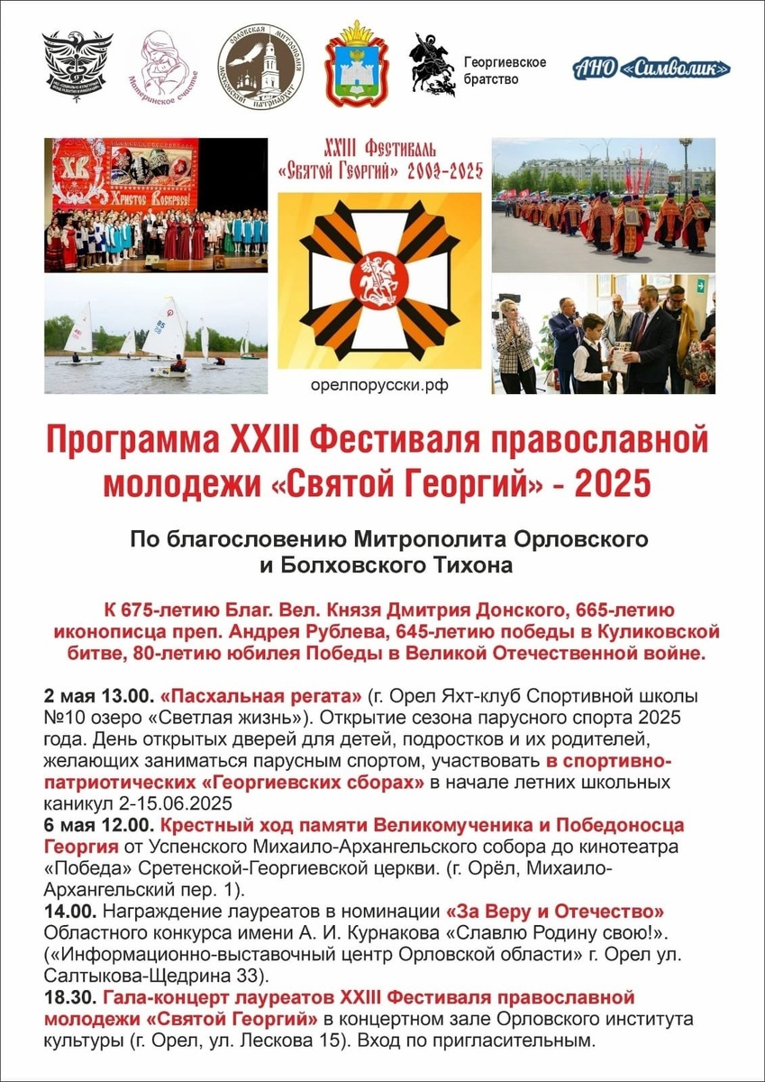 Во время открытия соревнований молебен совершил председатель молодежного отдела Орловской епархии иерей Дионисий Костомаров. Сама регата прурочена к традиционному орловскому фестивалю "Святой Георгий".