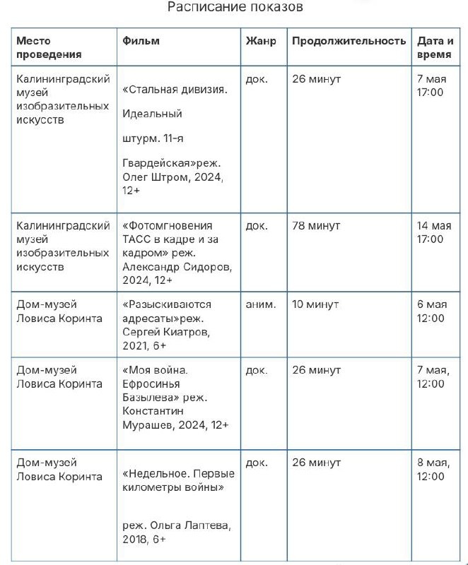 В Музее изобразительных искусств в Калининграде и в доме-музее Ловиса Коринта в Гвардейске пройдёт V Международный фестиваль правильного кино (6+). Мероприятие состоится с 7 по 14 мая. В программе — фильмы, посвящённые идеям гуманизма, милосердия и преемственности поколений. В музеях представят следующие фильмы: 🔵 «Стальная дивизия» — история штурма города-крепости Кёнигсберг в 1945 году и подвига 11-ой стрелковой гвардейской дивизии; 🔵 «Фотомгновения ТАСС. В кадре и за кадром» — рассказ о фоторепортёрах агентства, чьи фотографии сохранили ключевые моменты истории России с начала XX века; 🔵 «Разыскиваются адресаты» — мультфильм о путешествии двух подростков из нашего времени в 1941 год и попавших на строительство Казанского обвода — одного из важнейших оборонительных рубежей; 🔵 «Моя война. Ефросинья Базылева» — документальная лента о юной связной партизанского отряда, которая в 11 лет помогала бороться с фашистами; 🔵 «Недельное. Первые километры войны» — фильм о жителях села Не