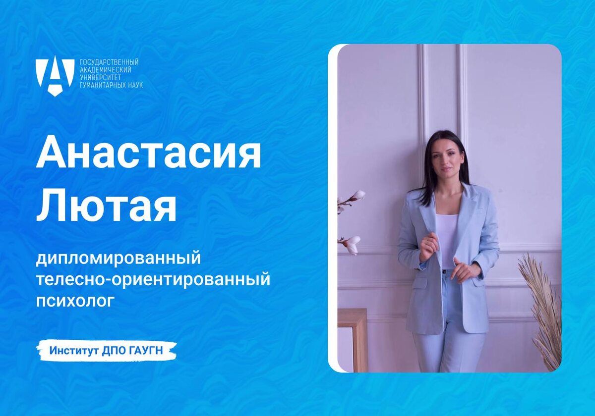 💆🏻 Представляем эксперта в телесной осознанности Институт ДПО ГАУГН рад представить эксперта, который поведет вас в мир телесной осознанности и эффективных практик – Лютую Анастасию! 👩🏻🏫 Анастасия Лютая – дипломированный телесно-ориентированный психолог с богатым опытом работы. За ее плечами годы практики, множество успешно проведенных консультаций и глубокое понимание взаимосвязи тела и психики. ✨ Но это ещё не всё! Анастасия Лютая – автор уникальной методики массажа, сочетающего ТОТ и медицинский массаж для глубокой релаксации и эмоционального высвобождения. 📋 Под руководством эксперта на курсе вы: 🏛 Получите глубокие знания в области телесно-ориентированной терапии. 🏛 Освоите практические техники работы с телом для решения различных психологических проблем. 🏛 Научитесь интегрировать телесные практики в свою профессиональную деятельность. 🏛 Получите ценную обратную связь и поддержку от опытного эксперта. «Телесно-ориентированная терапия не решит всех проблем, но она