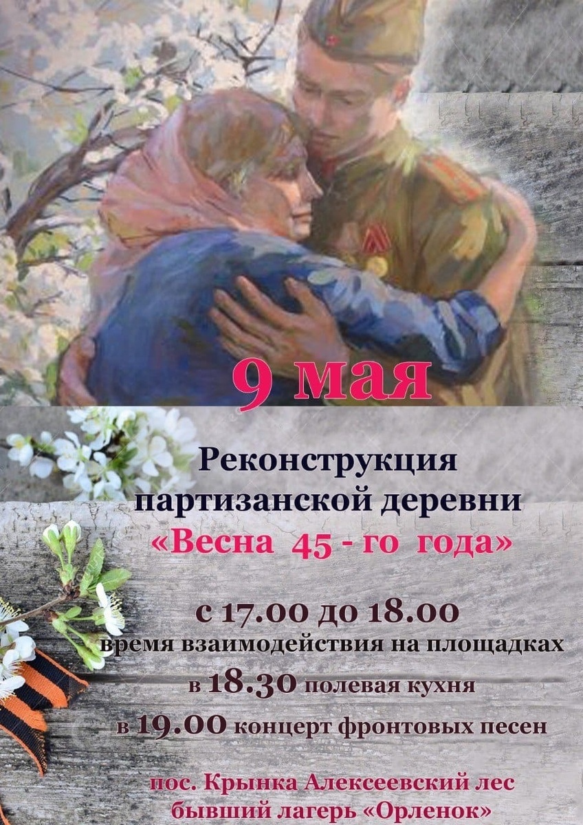 ✏️ Дальняк.рф™: 9 мая с 17.00 до 21.00 на территории Алексеевского леса пройдет реконструкция Партизанской деревни "Весна 45 го года!" Зрители максимально погрузятся в атмосферу военных лет, узнают историю о том как люди уходили в лес, помогали фронту, формировали партизанские отряды и жили в лесной деревне. Зрители смогут лично принять участие в действии на площадках: привал, биндаж, штаб, красный уголок, санчасть, школа, кузница, мастерские , прачка, баня, хоз двор, пекарня и две полевые кухни. С 17.00 и до 18.30 начнется время взаимодействия жителей деревни и гостей праздника. Каждый сможет помесить тесто в пекарне и приготовить хлеб; помочь на кухне в приготовлении обеда; посетить школу и послушать историю, написать письмо солдату , поиграть с детьми в лапту и другие игры ; научиться вязать веники в бане; изготовить портянки и прочие предметы быта в мастерских; подковать лошадь в кузнице; помочь в хоздворе; научиться перевязывать раненных; оставить надпись на плакате победы; посмо