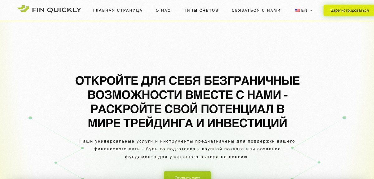 Finquickly.com — это онлайн-платформа для торговли различными финансовыми активами, включая валютные пары, акции и криптовалюты. На сайте заявлено, что трейдеры могут получать доступ к разнообразным рынкам, а также пользоваться аналитическими инструментами и обучающими материалами.
