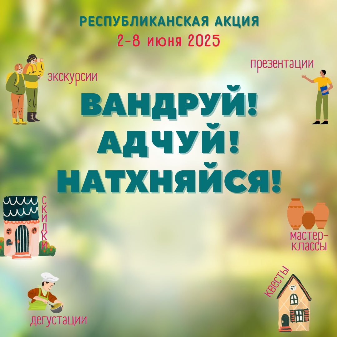 ⚡️«Вандруй. Адчуй. Натхняйся»! С 2 по 8 июня в Беларуси пройдет масштабная республиканская акция «Вандруй. Адчуй. Натхняйся», которая откроет для всех потенциал внутреннего туризма и всё разнообразие туристических возможностей Беларуси! 📅 Что вас ждет? Туристические объекты всех областей Беларуси смогут предложить своим посетителям бесплатные экскурсии и квесты, дни открытых дверей, мастер-классы, дегустации блюд национальной кухни и презентации услуг и специальные предложения 🏞 Кто может участвовать? В акции могут принимать участия агроэкоусадьбы, учреждения культуры и образования, объекты питания и проживания, санаторно-курортные учреждения, туристические комплексы, экологические парки и заказники, художественные и картинные галереи, производственные предприятия, спортивные учреждения и физические лица (экскурсоводы, гиды-переводчики, ремесленники и т.д.) 🚀 Как принять участие? Чтобы стать частью этой уникальной акции, заполните гугл-форму до 26 мая 2025 года. Организаторами