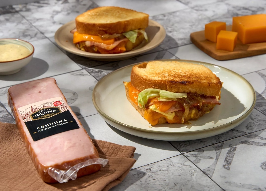 Сэндвичем с ветчиной и сыром никого не удивишь. Но если добавить к знакомой компании карамелизированный лук и острый майонезный соус, закуска заиграет новыми красками. Начните приготовление с соуса. Ему понадобится время, чтобы настояться. Затем пожарьте лук. Чтобы зажарка приобрела красивый карамельный загар, добавьте к луку сахар, мед и яблочный укус. Остается тонко нарезать ветчину и сыр, собрать сэндвич и подрумянить его на сковороде. Варенно- копчёная грудинка 30 г Хлеб на закваске 2 ломтик = 60 г Чеддер 30 г Растительное масло 2 ст. л. = 34 г Майонез 2 ст. л. = 50 г Соус чили 2 ст. л. = 36 г Чеснок 1 зубчик = 5 г Мед 2 ст. л. = 56 г Яблочный уксус 1 ст. л. = 15 г Черный перец молотый по вкусу Микс салатов по вкусу Репчатый лук 1 шт. = 80 г Сахар 1 ч. л. = 8 г Мед 1 ст. л. = 28 г Яблочный уксус 1.5 ч. л. = 7.5 г Соль по вкусу Черный перец молотый по вкусу Почистите репчатый лук и чеснок. Подготовьте обычную сковороду и сковороду-гриль. Пропустите через пресс чеснок. Смешайт