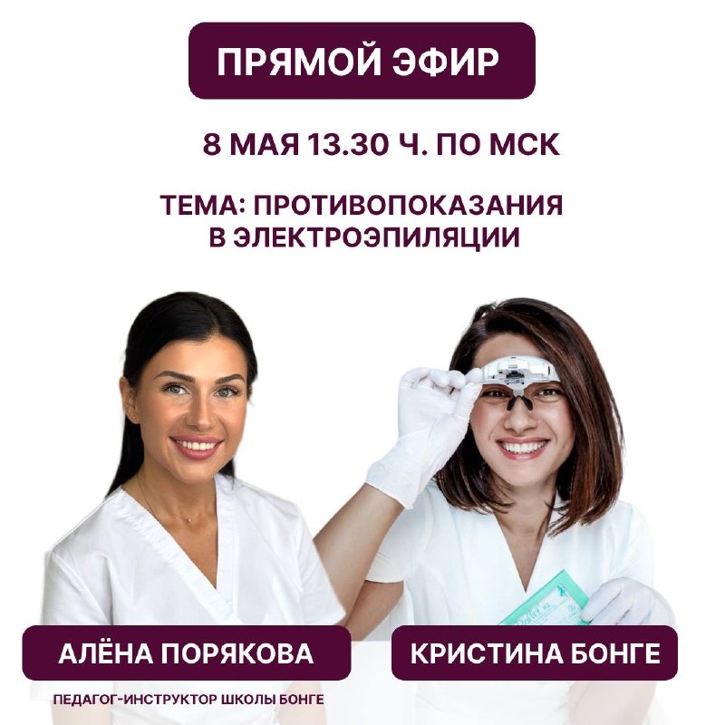 Новый эфир в нашем марафоне эфиров ✨ 📆 8 мая в 13.30 ч по МСК здесь на канале ✨ Тема: «Противопоказания в электроэпиляции» Спикер: Алёна Порякова, педагог-инструктор школы Бонге, г. Челябинск. Ждём всех 🫶 Будем разбирать: ⚪️какие противопоказания реальны, а какие просто миф. ⚪️как не потерять клиента, соблюдая безопасность. Ссылка для подключения: https://dzen.ru/id/651c04de4e191e4a5f6c3e86
