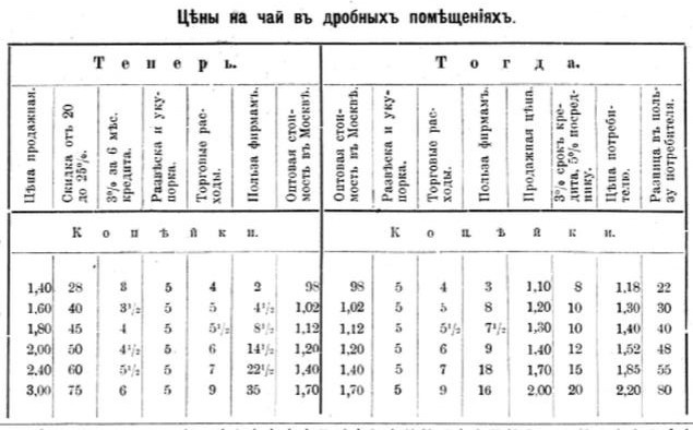 Что принесла бы практика при таком узаконении? Она сразу заставила бы развешивать чай в этикеты с иными, более низкими ценами, чем теперь и потребитель тотчас бы узнал, как много переплачивал он раньше посредникам, за их сравнительно пустые услуги. Вот, табличка цен, какие должны бы установиться, если бы была проведена указываемая мною мера, даже без изменения существующей пошлины (см. 14 cтp.).