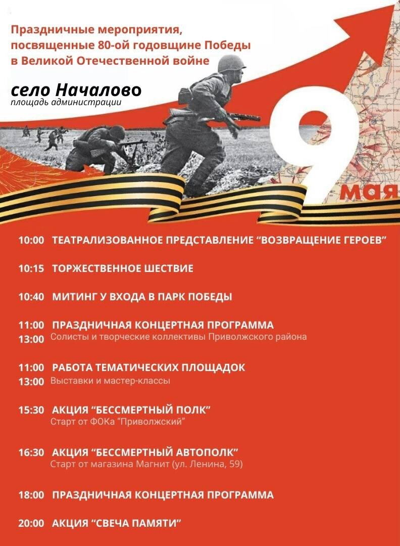 Масштабное празднование 80-летия Победы в Великой Отечественной войне пройдет в селе Началово Мероприятие обещает стать ярким и запоминающимся событием для всех жителей и гостей села. Подготовлена насыщенная программа: песни военных лет, танцевальные номера и театрализованные представления. Кульминацией вечера станет акция «Свеча Памяти». Приглашаем всех желающих принять участие в этом важном и знаменательном событии! #Приволжскийрайон