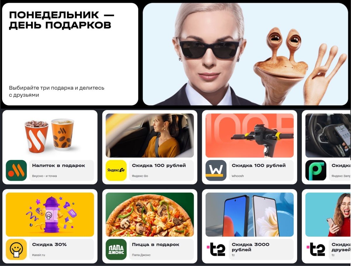 Т2 запускает заново акцию, в рамках которой можно получить до трех подарков — но только по понедельникам. Действует с 5 мая по 16 июня 2025 Промокод выдаётся сразу при нажатии на кнопку «получить подарок» — без дополнительного подтверждения. Акция работает только по понедельникам: как на получение, так и на использование. Наполнение отличается по регионам. Список доступных бонусов — в разделе «Больше» в приложении. Найти предложения можно в приложении → вкладка "Больше" на главной. Список подарков в этот понедельник для Москвы: ● Напиток в подарок во «Вкусно — и точка» ● Чикенбургер в подарок во «Вкусно — и точка» ● Скидка 100 рублей в Яндекс Go (такси) ● Скидка 100 рублей в Яндекс Заправки ● Скидка 100 рублей в Whoosh (самокаты) ● Скидка 15% в Лента ● Скидка 15% в Пятёрочка Доставка ● Пицца в подарок в Папа Джонс ● Скидка 30% на билеты Kassir.ru ● Подписка в подарок в Литрес ● Подписка в подарок в MiXX ● 7 дней в подарок на Ростелеком Лицей ● 200 ВАУ-баллов в OZON ● Игровые бонусы в