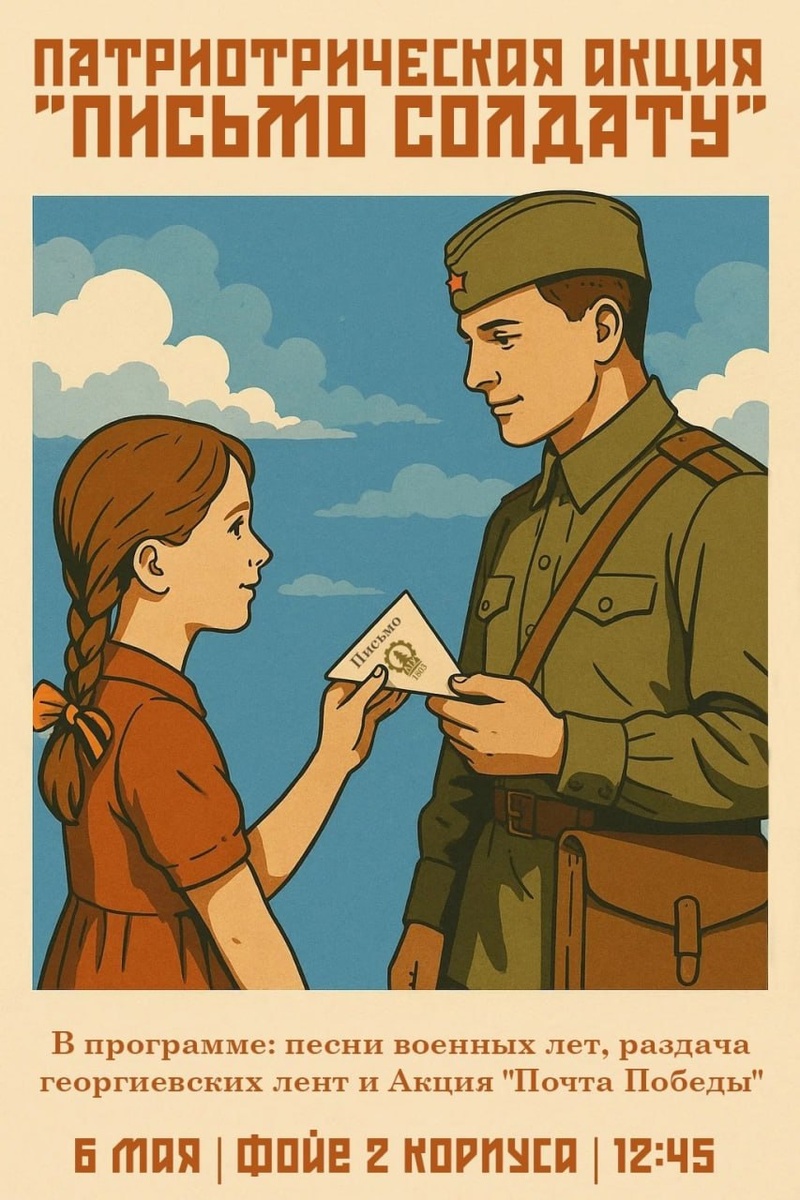 Дорогие студенты ⚡️ 🎖 Студенческий патриотический клуб «Егерский корпус» приглашает вас принять участие в патриотической акции «Письмо солдату». В рамках мероприятия вас ждут раздача Георгиевских лент, исполнение военных песен и участие во Всероссийской акции «Почта Победы». 📅 Акция состоится 6 мая с 12:45 до 13:30 в фойе 2-го корпуса. Будем рады видеть каждого из вас! Присоединяйтесь! 👀